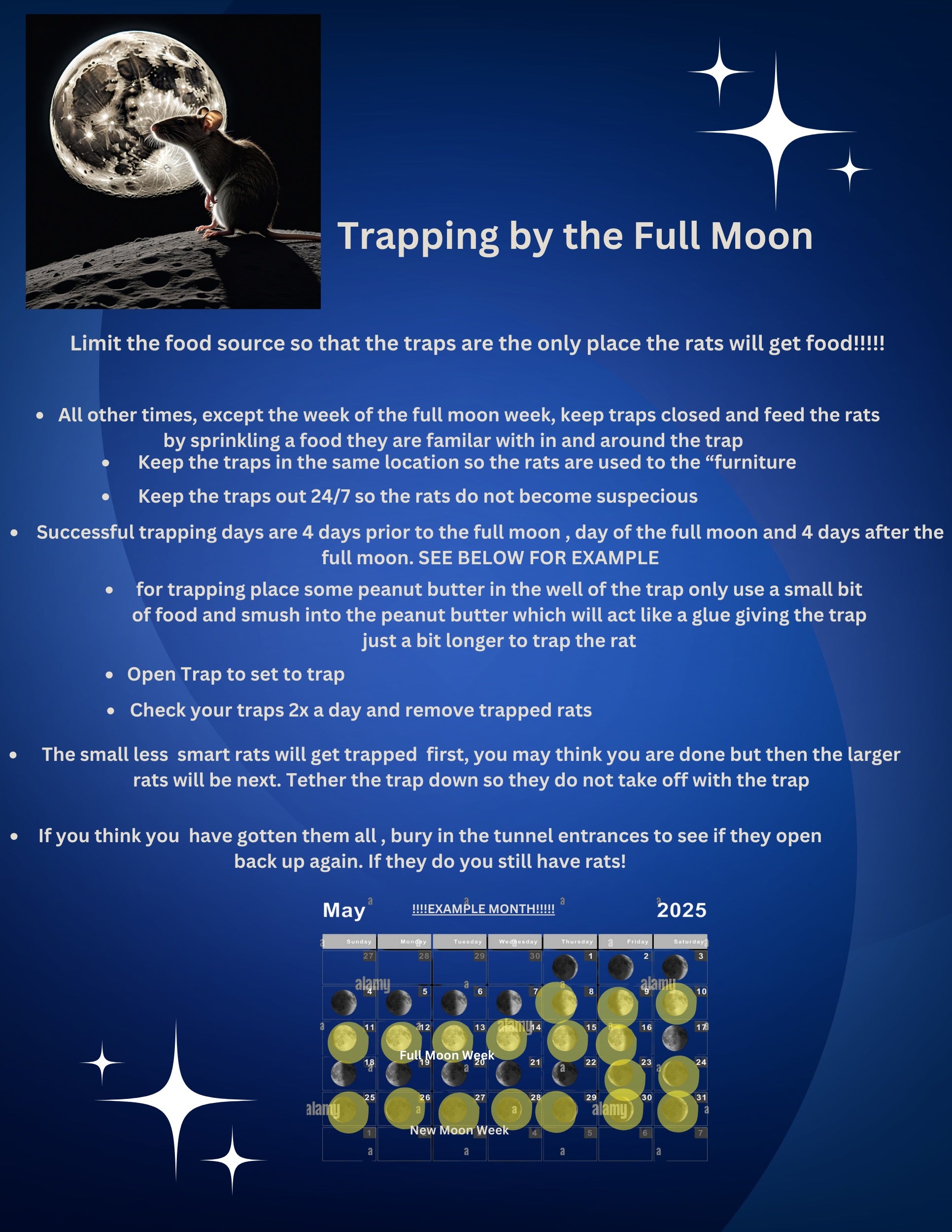 Be sure to use our quick reference quide on how to trap rats by the full moon! Our clients have huge success with this method!